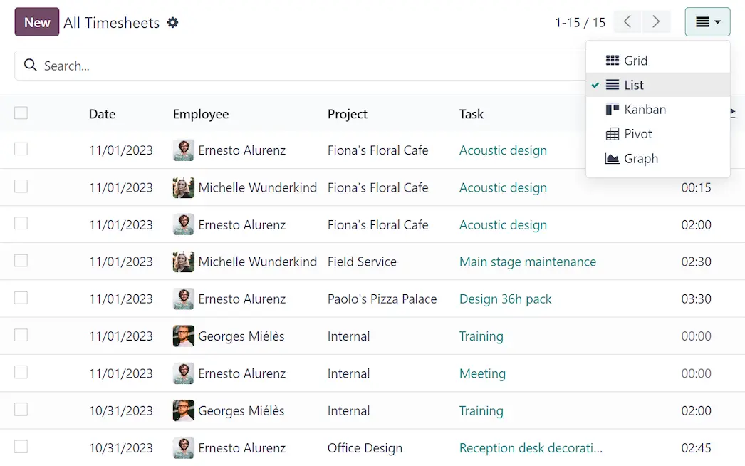 Con Odoo Control de Horarios, supervisa el tiempo registrado en tareas y proyectos, la dedicación de cada empleado y las horas facturables, todo sincronizado con Proyectos y Facturación.