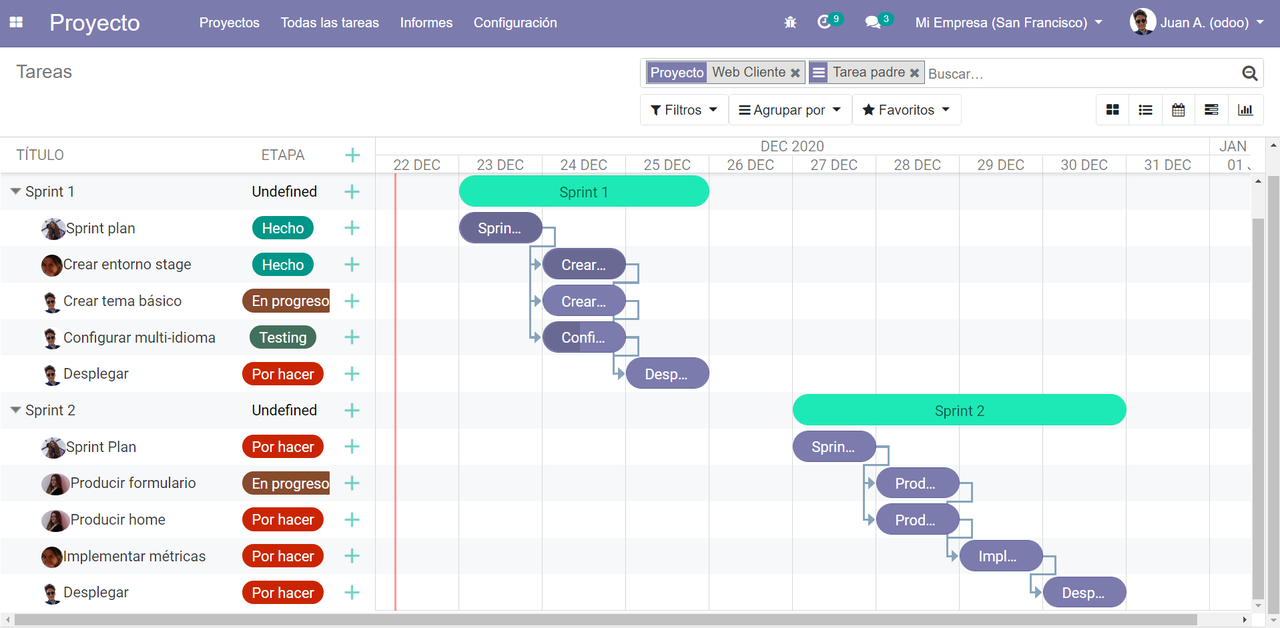 Odoo Proyectos es el módulo completo de gestión de proyectos del ecosistema Odoo. Permite planificar, asignar recursos, seguir el progreso y analizar la rentabilidad de todos tus proyectos desde una interfaz intuitiva y visual.